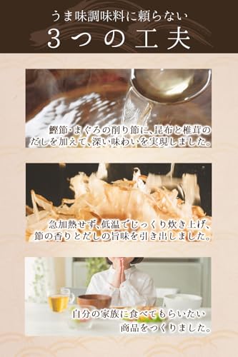 - 二種類のかつお節原料を独自にブレンドすることで、コクと旨味を引き出している
