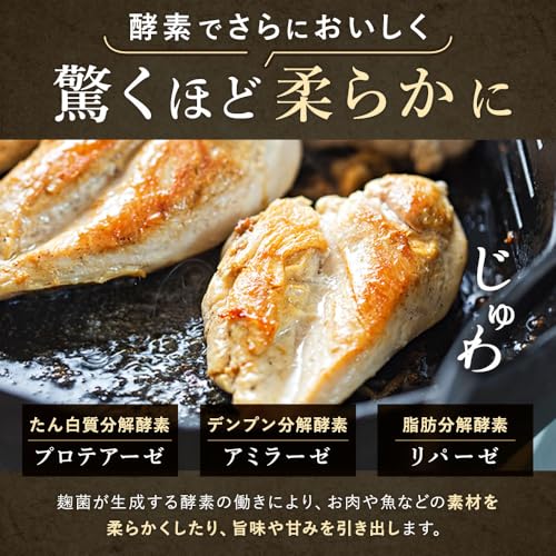 肉や魚を塩麹に漬けると酵素(プロテアーゼ)の働きによって、たんぱく質をアミノ酸に分解してくれます。 するとうまみが増し、肉や魚は柔らかくなります。