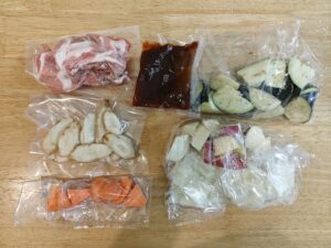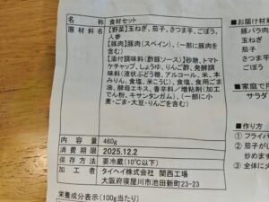 開けると豚肉、野菜類、ソースが入っていました。