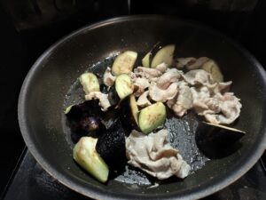 フライパンを熱して油大さじ1と1/2を入れ、豚肉と茄子を炒めます。
