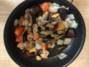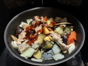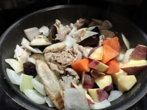 茄子がしんなりしてきたら玉ねぎ、ごぼうレンジ加熱したさつま芋、ニンジンを加え、中火で5分炒めます。