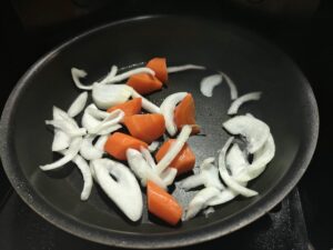 鍋を熱して油大さじ1を入れ、たまねぎ、にんじんを中火で2分炒めます。