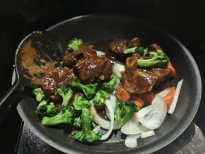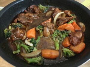 鶏肉をソースごと、ブロッコリーを入れて弱火で6分じっくり煮込み完成です。