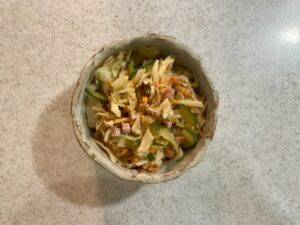 和え物にベーコンを軽く混ぜ、お皿に盛りつけたら完成です。