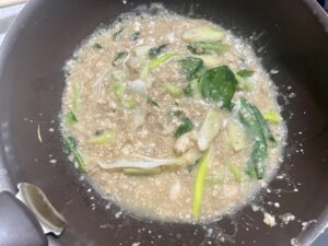 小松菜がシャキシャキしていて柔らかい豆腐とのコントラストが良い相性を生み出しています。