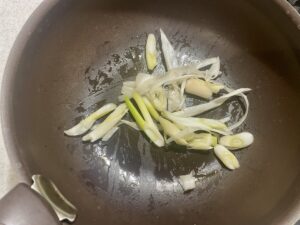 フライパンを熱し油をなじませ、長ネギを入れ弱火で約1分炒めます。