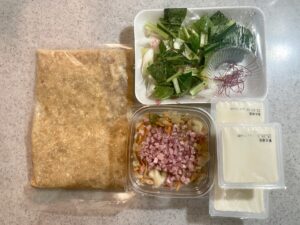 開封すると、小松菜・長ネギ・糸唐辛子が同じパックに入っています。そのほかソースや豆腐はそれぞれ合われて入っています。