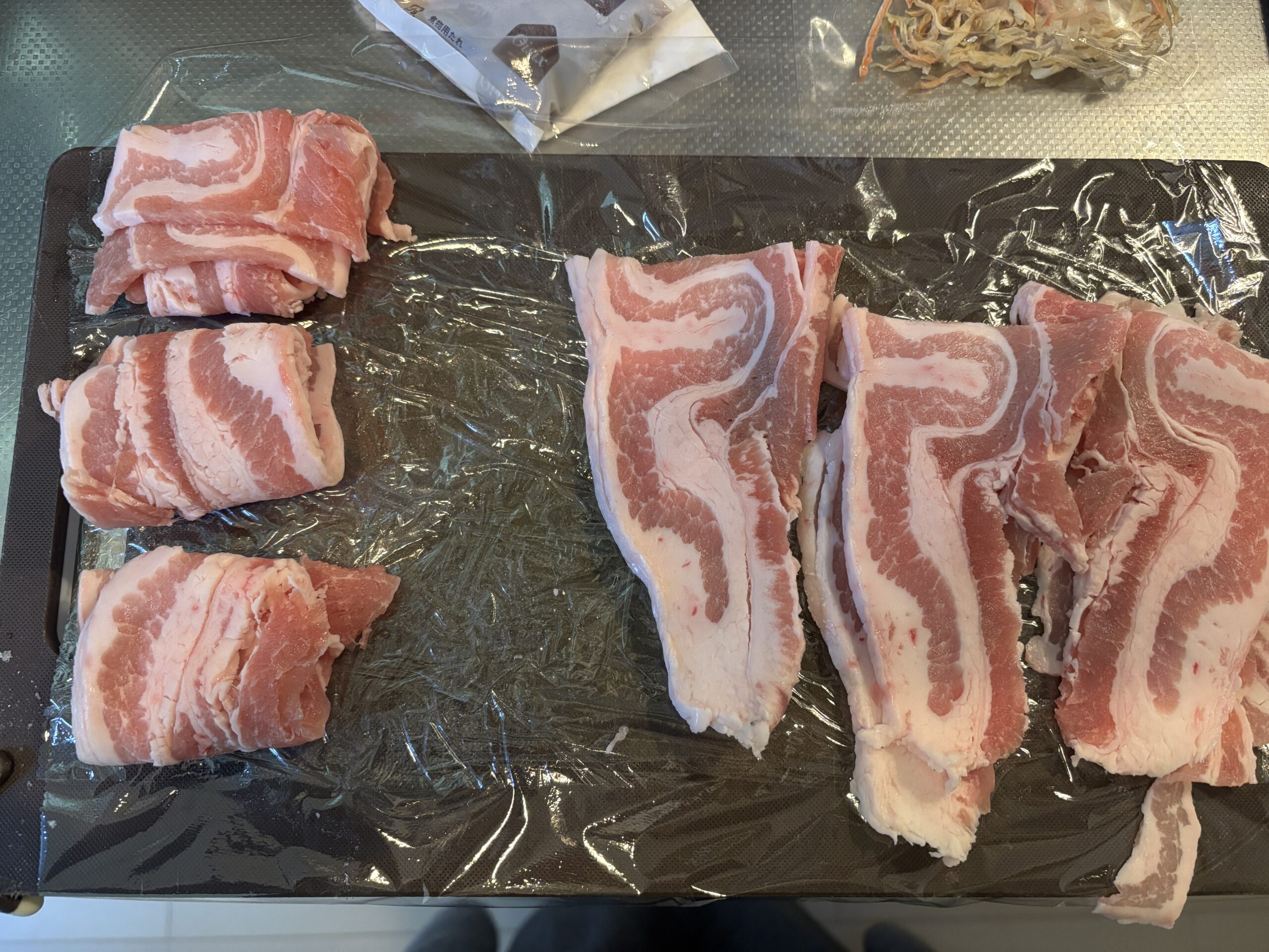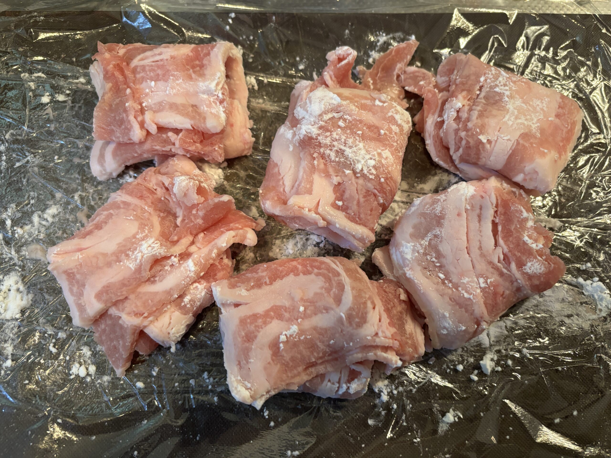 解凍した豚肉を6等分に分けて三つ折りにしていきます。