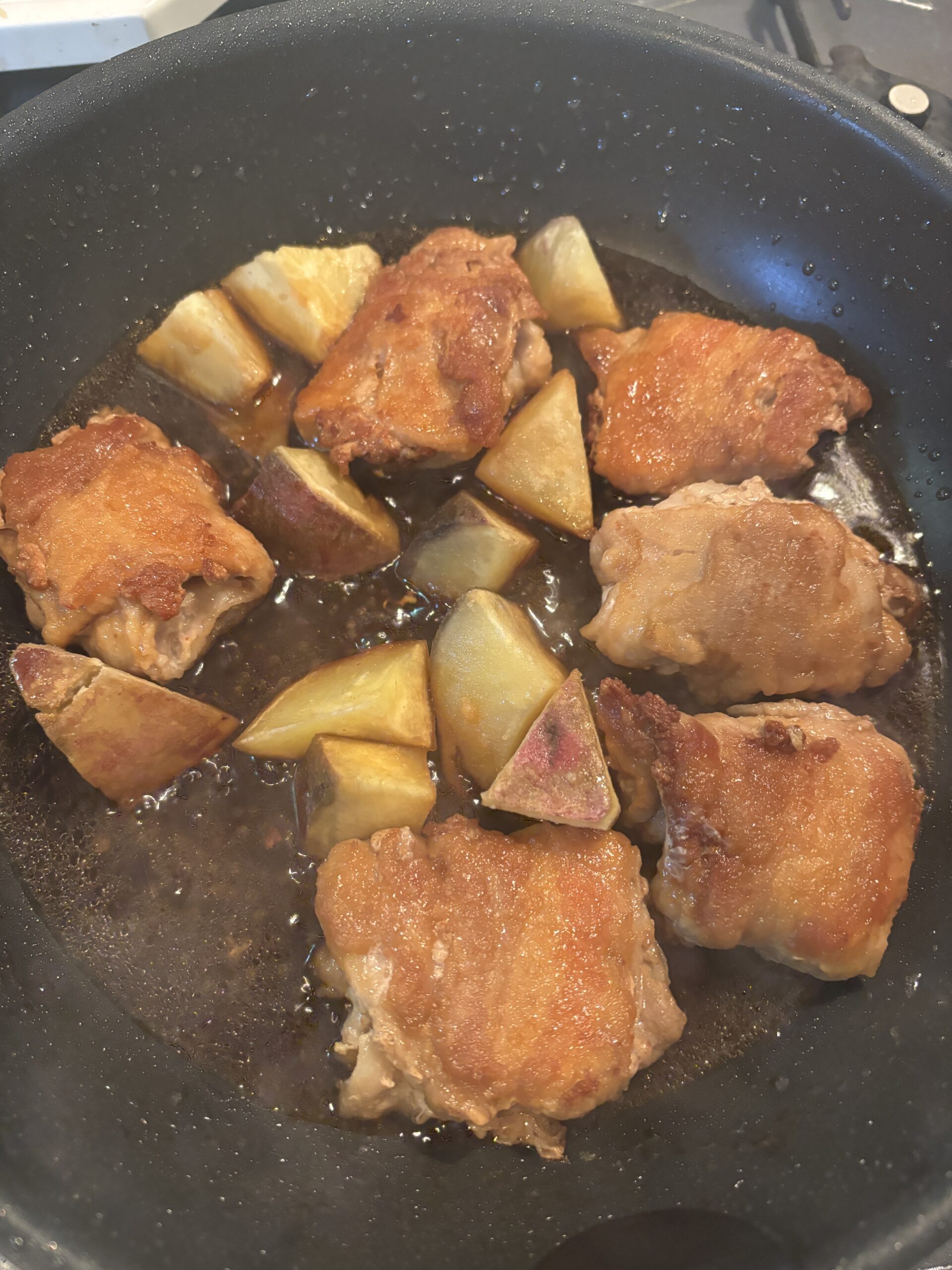 主菜に戻り、ふたをとりさつまいもを加えます。
