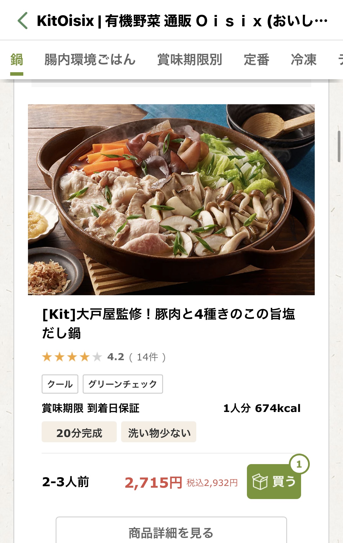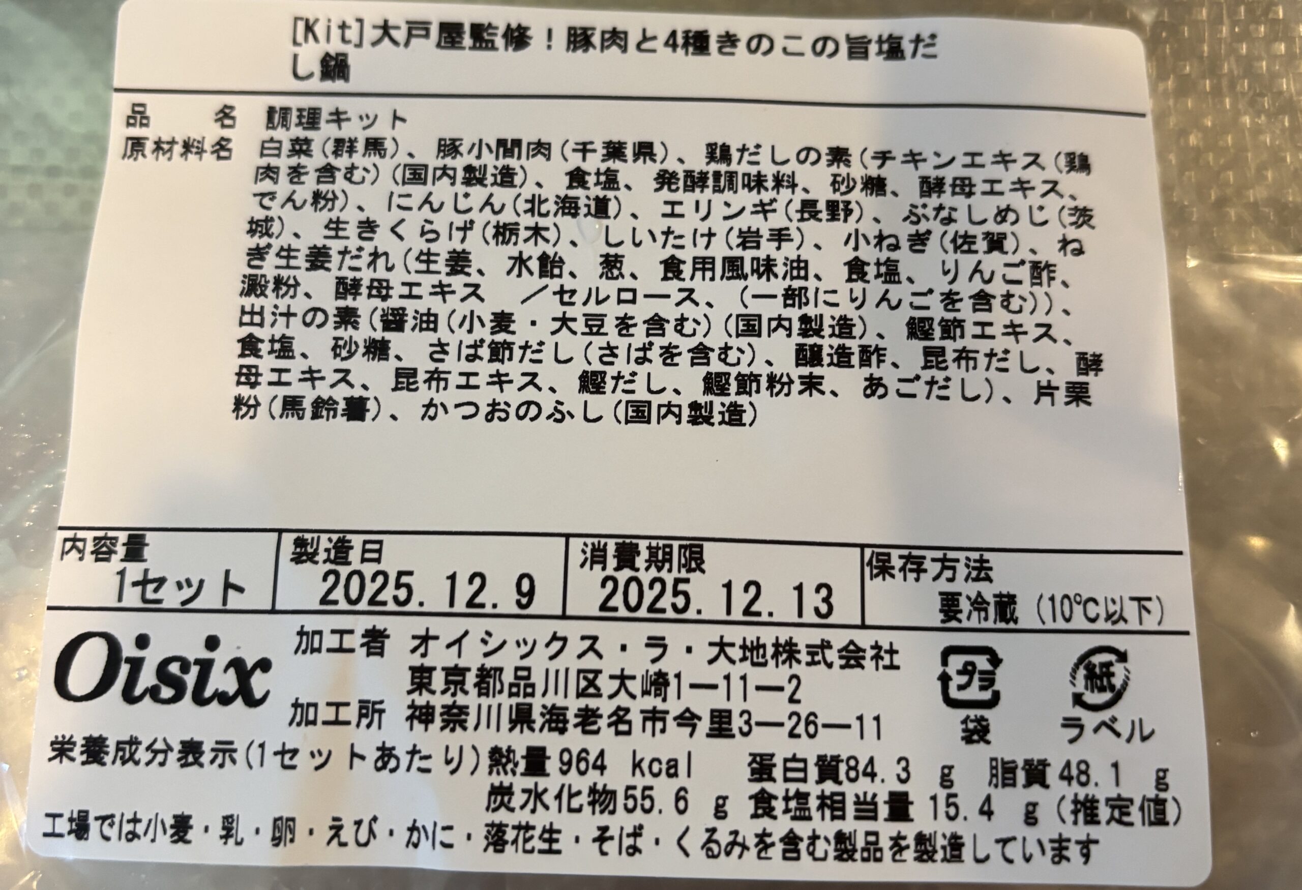 オイシックスのミールキットに「大戸屋監修!豚肉と4種きのこの旨塩だし鍋」という商品があります。