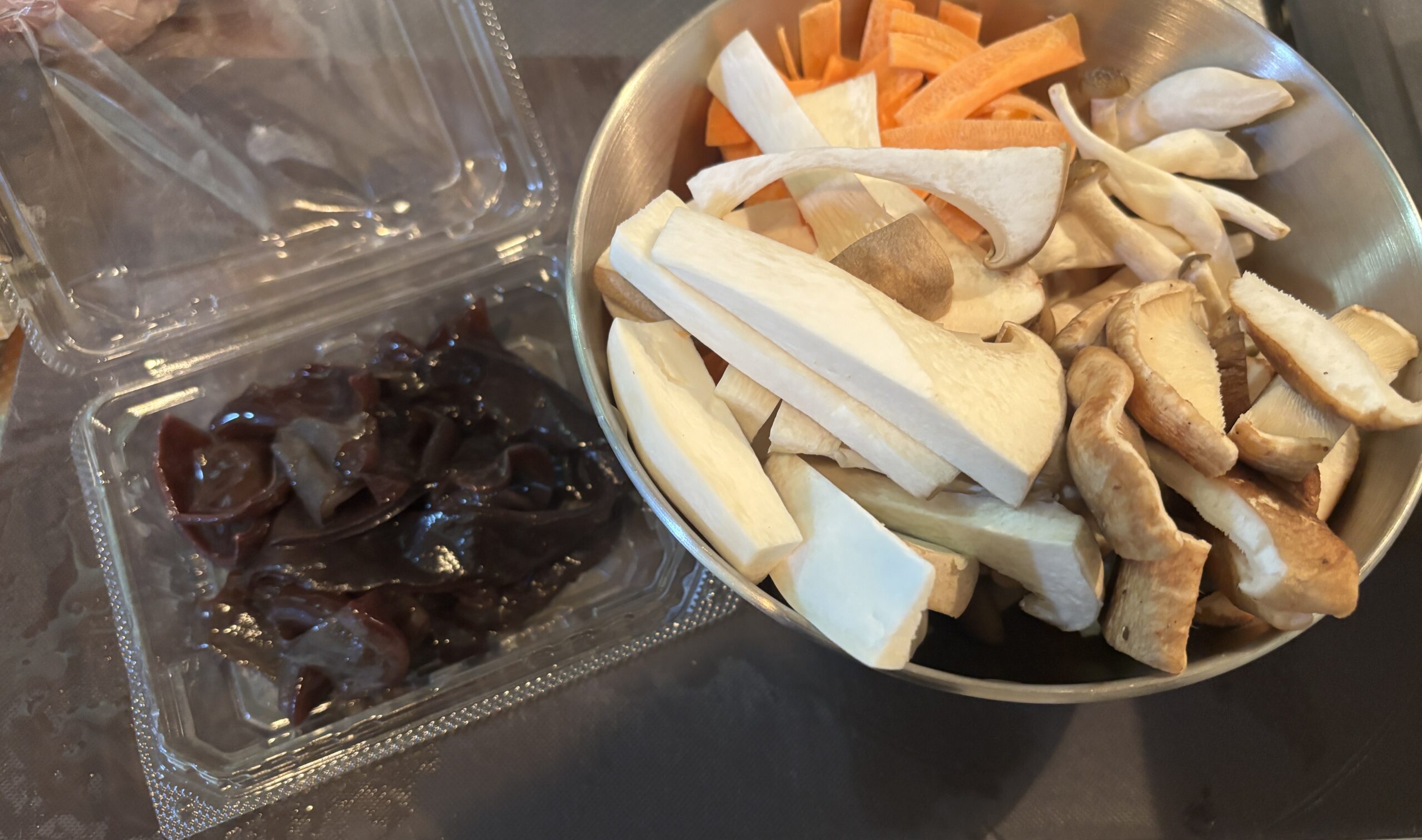 にんじんは北海道産、エリンギは長野県産、ぶなしめじは茨城県産、生キクラゲは栃木県産、しいたけは岩手県産、小ネギが佐賀県産でした。