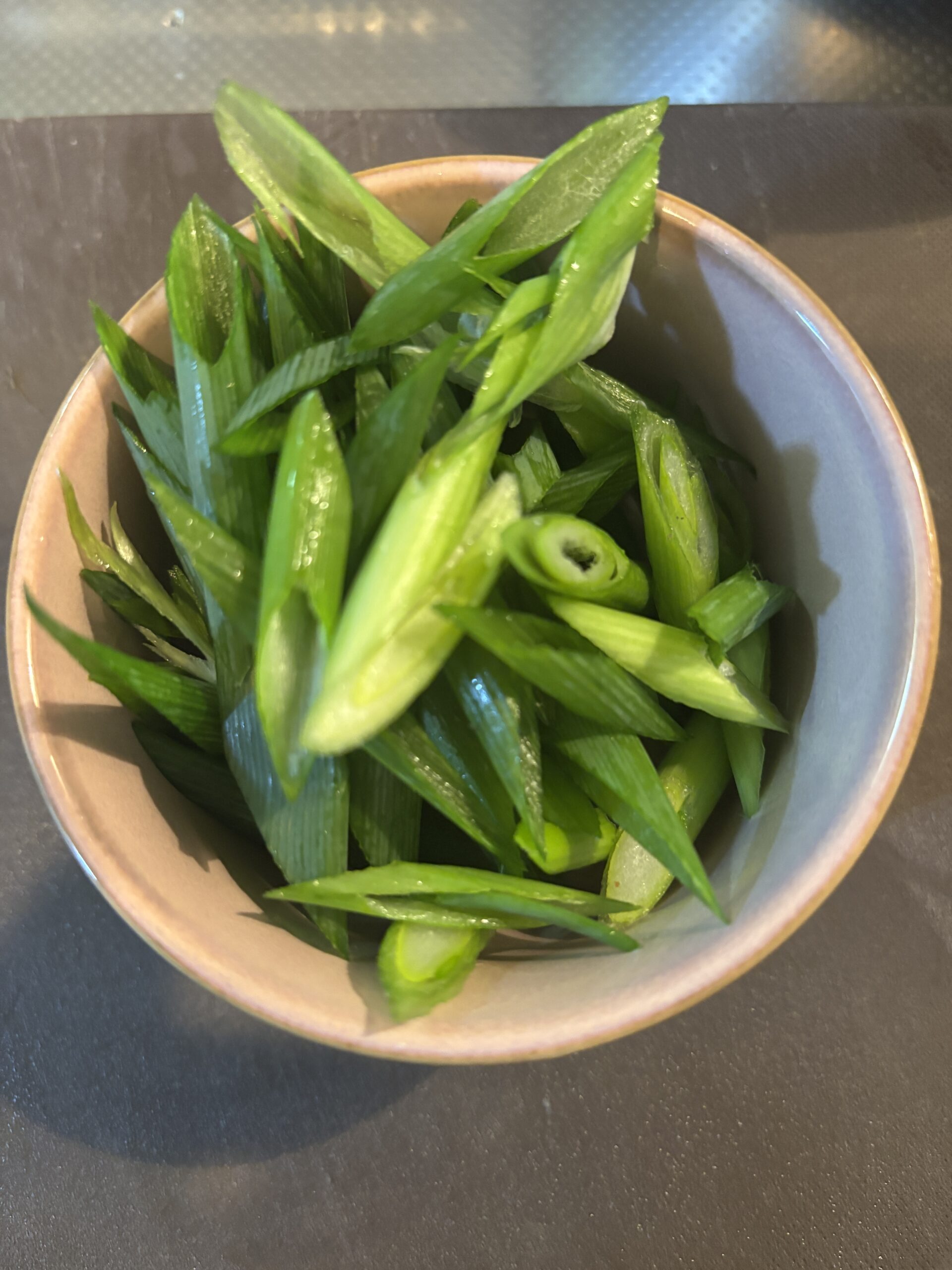 ふたをして4.5分弱めの中火で煮込み、仕上げにごま油を回し入れて小ネギをちらして完成です。