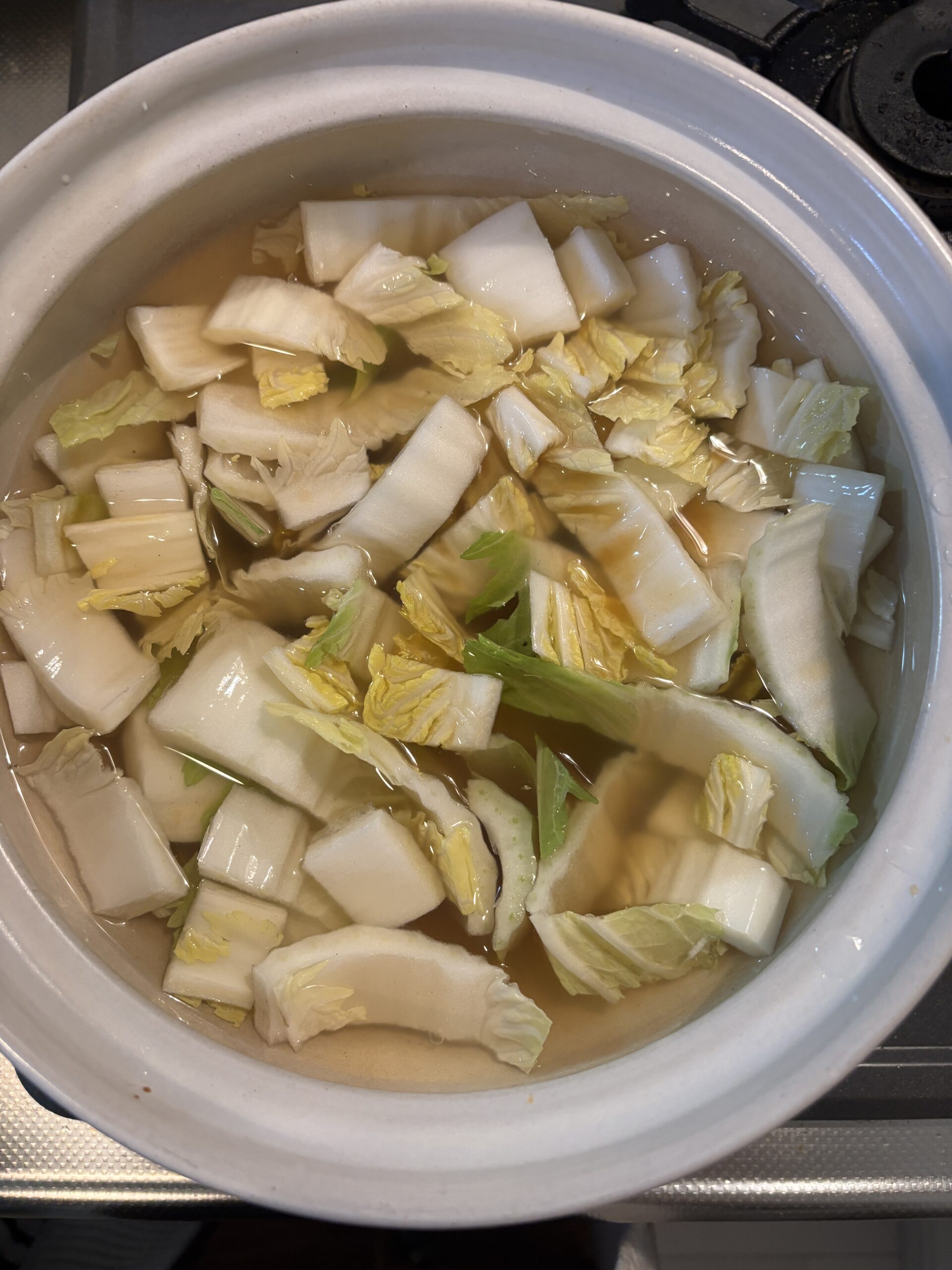 白菜は2.3cm幅にざく切りにしたら茎だけをお鍋へ入れます。