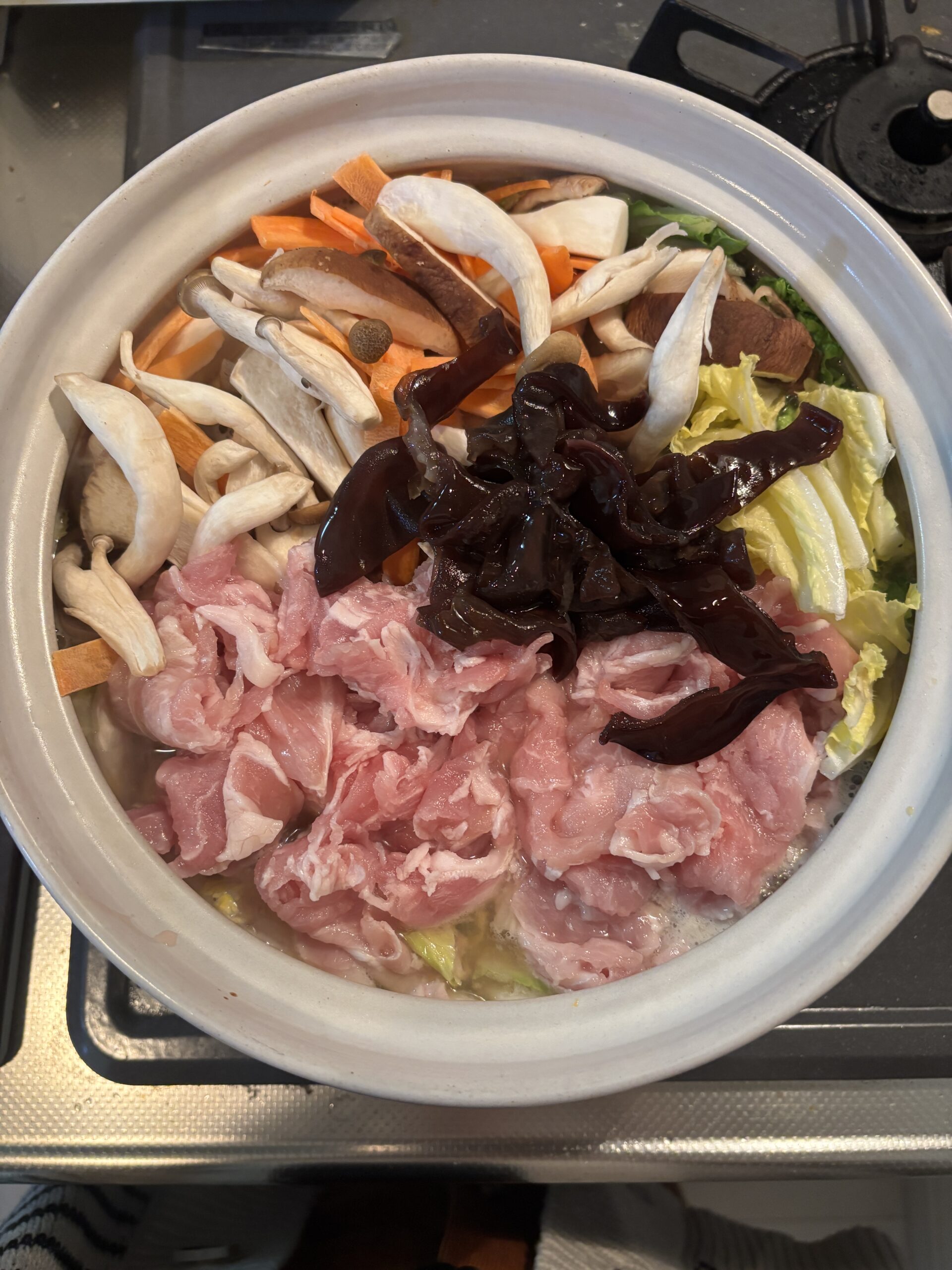 一煮立ちしたら、残りの白菜、にんじん、豚肉、しめじ、エリンギ、キクラゲ、しいたけを加えていきます。