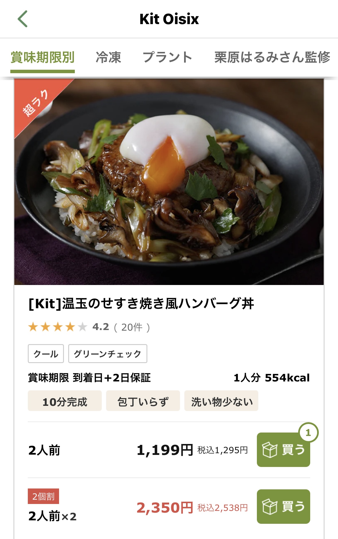 写真のように『買う』ボタンでカートに反映していきます。今回は超楽キットで包丁なしで作れるので選んでみました。