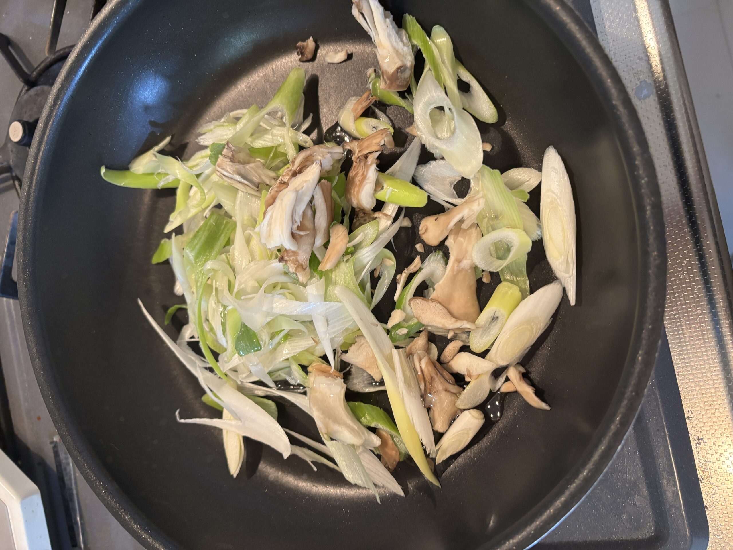 まずは開封していきます。長ねぎもカット済みなので包丁要らずです!野菜は軽く水で洗っておき、まいたけも既に一口サイズなので特に包丁は要らずで早速調理に進んでいきます。