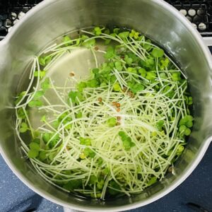 貝割大根は、根元を切ったあと半分に切り、先に沸かしておいたお湯で、さっと茹でます。