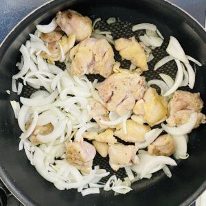 フライパンにオリーブ油を熱して鶏肉を焼き色が付くまで焼いたら裏返し、カット野菜を加えた後、蓋をして蒸し焼きにします。