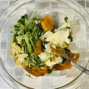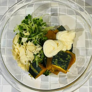 加熱したかぼちゃと茹でた貝割大根、アーモンドとマヨネーズなどの調味料をボウルに入れ、かぼちゃをつぶしながら和えていきます。