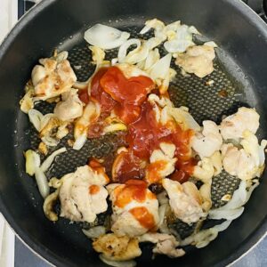 火が通ったら、同梱のトマトソースを加え、しょうゆで味を調えます。