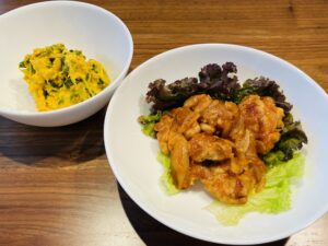 サラダはかぼちゃの甘みとアーモンドの香ばしさが良いアクセントで、野菜が苦手な子でも食べやすい印象です。