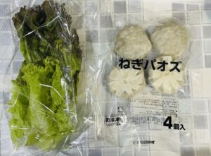 豚肉入り回鍋肉の素(冷凍)、カット野菜(キャベツ・玉葱、ピーマン・人参)、ねぎパオズ(冷凍)、 グリーンリーフ