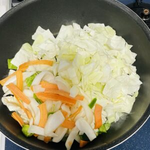 回鍋肉の野菜をすべてフライパンに入れ、炒めます。