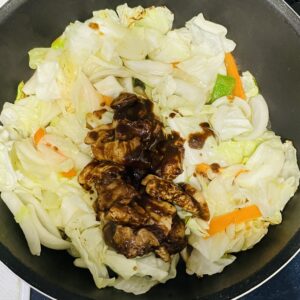 野菜に火が通ったら、解凍しておいた回鍋肉の素と水を加えて、水分が飛ぶまで更に炒めます。