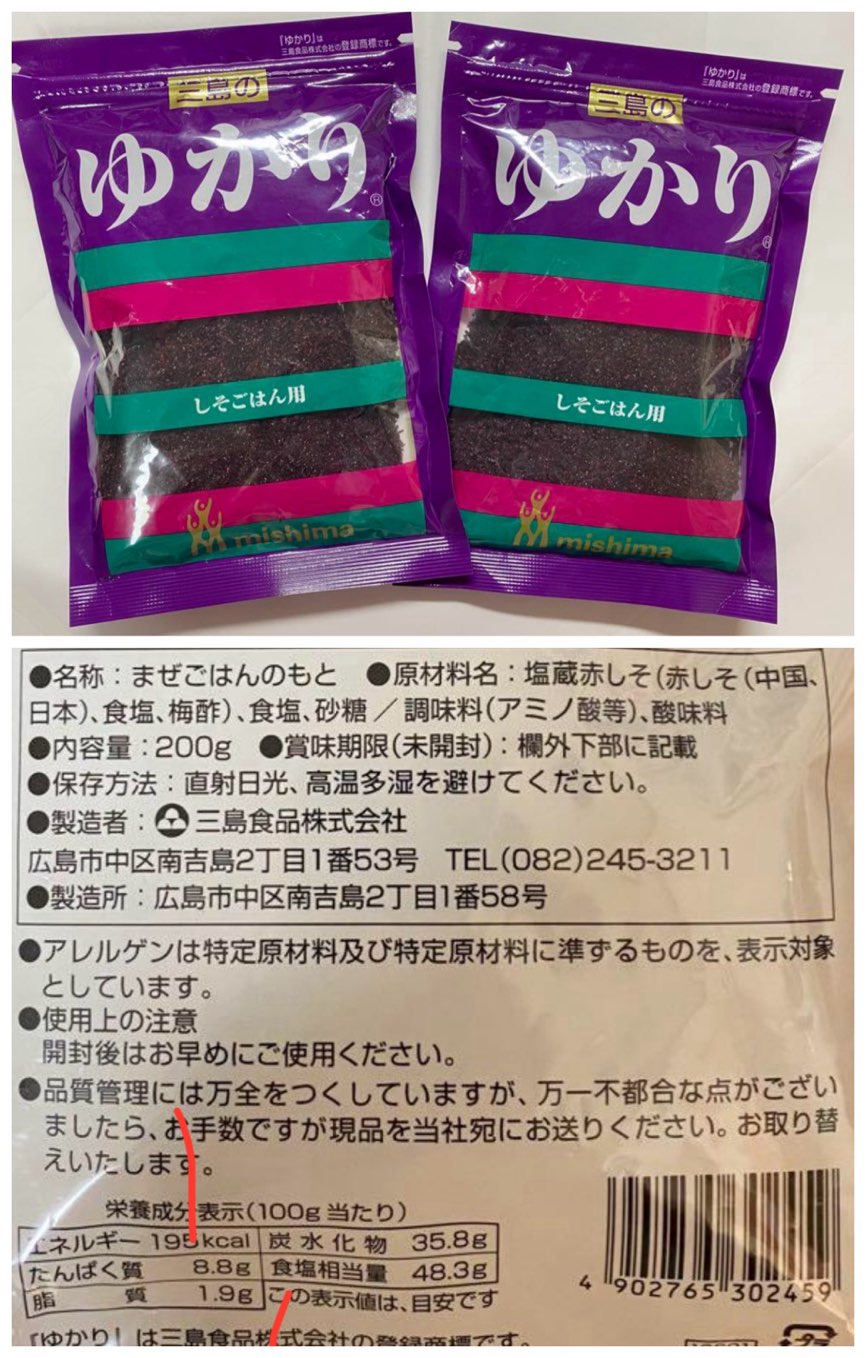 • 「ゆかり」は工場ラインを要チェック: 多くの食品メーカーは、特定原材料を扱っている場合、「本品製造工場では、卵・乳成分・小麦・えび・かにを含む製品を製造しています」といった注意書きを、原材料表示の下などに記載しています。
